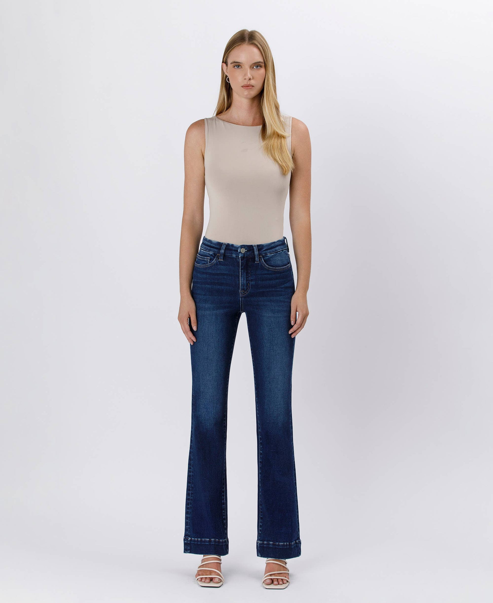 COMFORT STRETCH DENIM, HIGH RISE WAIST, TROUSER HEM, FULL LENGTH, BOOTCUT JEANS